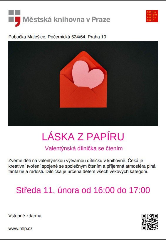 Zveme děti na valentýnskou výtvarnou dílničku v knihovně. Čeká je kreativní tvoření spojené se společným čtením a příjemná atmosféra plná fantazie a radosti. Dílnička je určena dětem všech věkových kategorií.